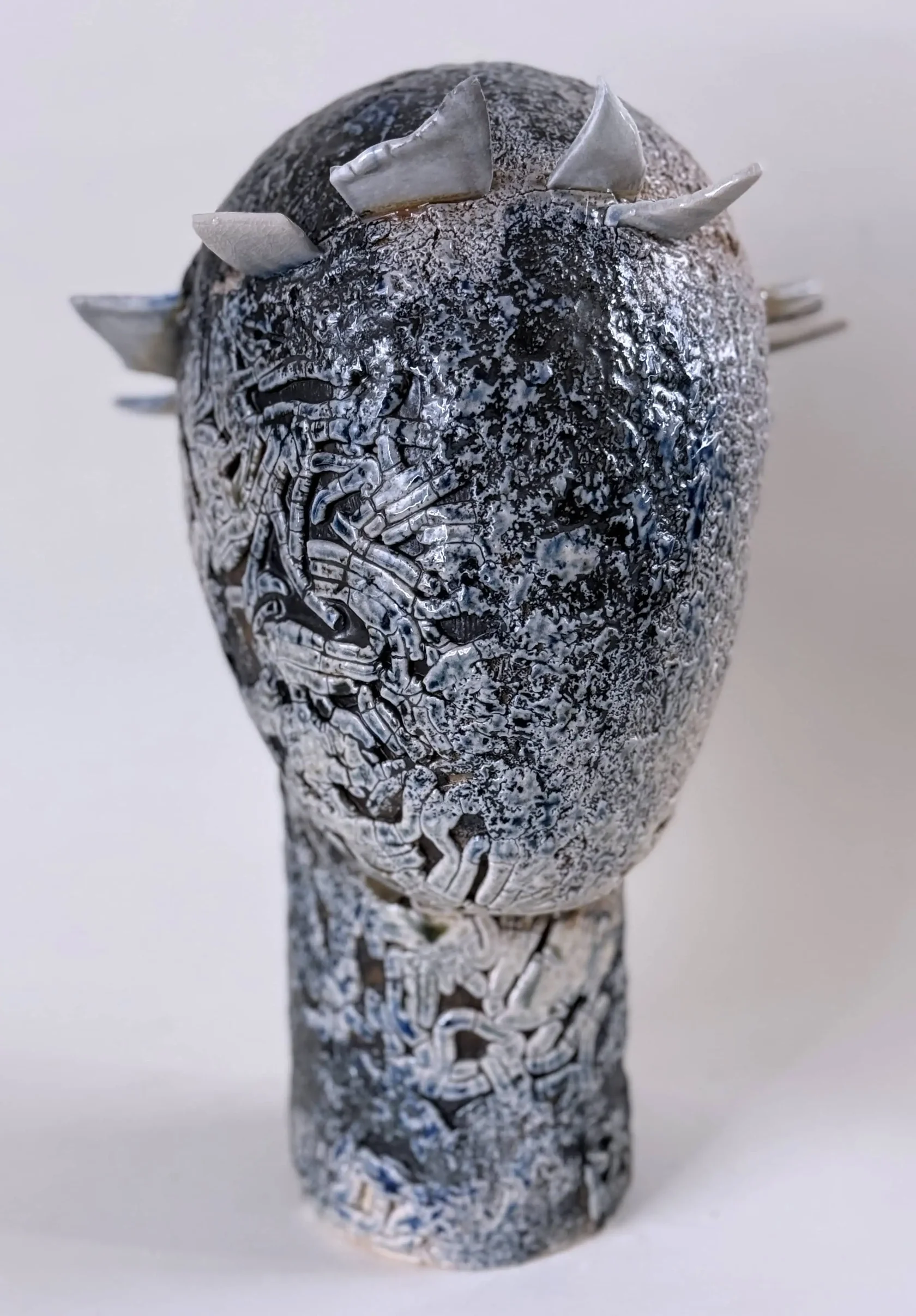 Stoneware, porcelain, cobalt oxide, glazes, wood firing, 13 x 9 x 9 in, 2024